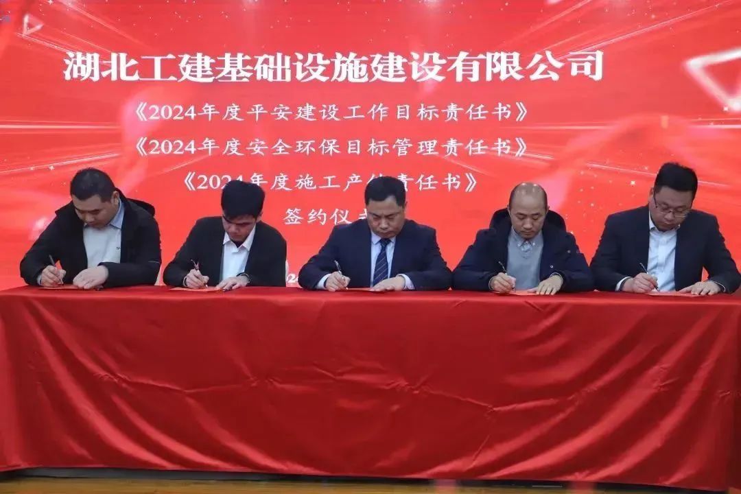 會議還組織了簽約儀式,馮文漫與支部書記代表簽訂《2024年度黨建工作目標責任書》,與黨委副書記、執行總經理潘誠文簽訂《2024年度經營目標責任書》。潘誠文與項目經理代表簽訂《2024年度平安建設工作目標責任書》《2024年度安全環保工作目標責任書》《2024年度施工產值責任書》。
